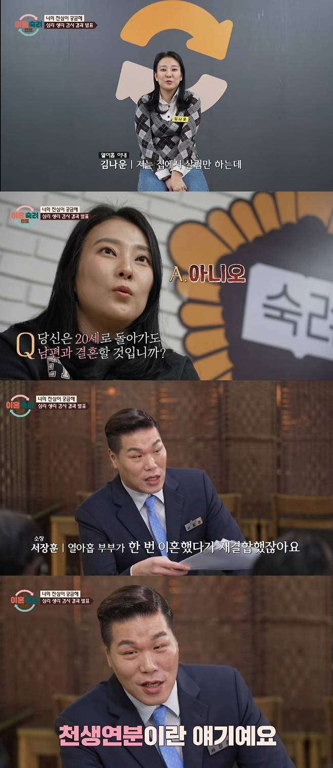 그러나 남편과 결혼하지 않겠다던 아내의 결과는 '거짓'이 나왔다. 서장훈은 "10초간 숨을 참으셨다. 그건 고민을 많이 했다는 흔적이다. 그리고 이분들은 한 번 이혼을 했다가 재결합했다. 천생연분이라는 얘기다"라며 "보통 이혼한 부부가 재결합하기는 진짜 쉽지 않다. 거의 없다"고 덧붙였다.