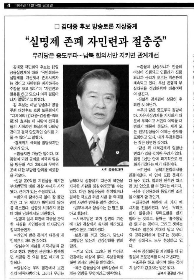 | ▲ 김대중 전 대통령이 "우리당은 중도우파"라고 발언한 신문 보도 |