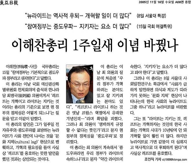 | ▲ 이해찬 국무총리가 지난 2005년 11월 15일 국회 예산결산특별위원회 전체회의에서 “참여정부는 기본적으로 중도우파 정부라고 생각한다”라고 말하기도 했지만, 이는 당시 ‘뉴라이트’에 대한 이 총리의 비판을 겨냥한 한나라당의 공격성 질문에 마지못해 내놓은 답변이었다.(동아일보, 이해찬총리 1주일새 이념 바꿨나) |