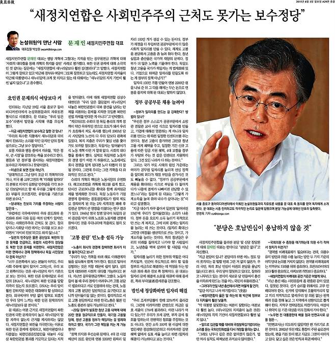 | ▲ 문재인 새정치민주연합 대표 시절 <동아일보> 인터뷰에서 “우리의 특수한 지형에서 새누리당과 대비해서 진보라는 소리를 약간 듣지만 당의 정체성으로는 그냥 보수 정당”이라고 말했다. <동아일보> 2015년 8월 3일 “새정치연합은 사회민주주의 근처도 못가는 보수정당” |