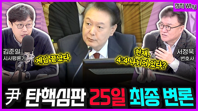▷ 정창준 : 헌법재판소가 윤 대통령 탄핵심판 변론 25일 종결하기로 했습니다. 탄핵 소추안이 국회에서 의결된 지 73일 만이라고 하는데 적절한 기간, 충분한 변론 기회가 보장됐는지. 어떻게 보세요? 김준일 평론가님.