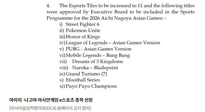 21일 게임업계에 따르면 아시아올림픽평의회(OCA)는 이달 초 중국 하얼빈에서 열린 집행위원회 회의에서 2026 아이치·나고야 AG e스포츠 세부 종목을 11개로 확대했다.