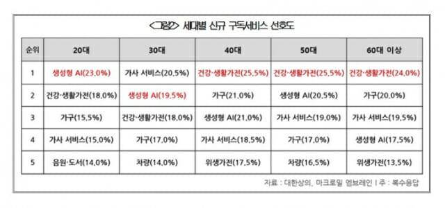 대한상공회의소가 발표한 소비자 구독서비스 이용실태 분석 결과에 따르면, 20대의 23.0%, 30대의 19.5%가 생성형 AI 서비스를 새롭게 이용해보고 싶은 구독서비스로 선택했다.