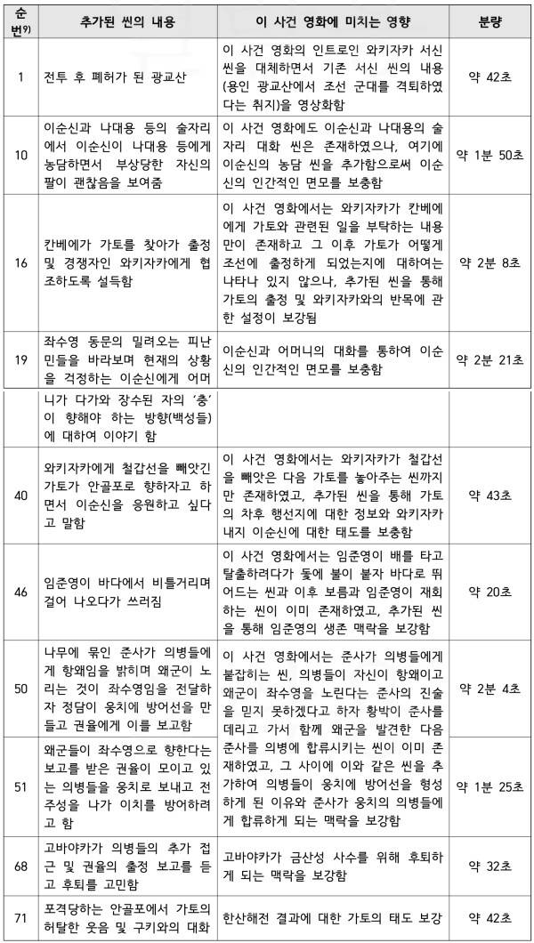 '한산: 용의 출현'의 러닝타임은 129분이다. 감독판은 21분을 더 추가했다. 분량 확인 결과 실제 새로운 분량은 13분이다. 7분은 기존 씬을 더 길게 편집한 것으로 확인됐다.