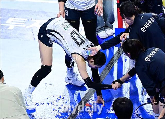 공격 성공률 50%, 리시브 효율 100%를 기록한 도로공사 배유나가 중계방송사 선정 최우수선수로 뽑혔다. 인터뷰를 마친 배유나는 동료들의 시원한 물 세례를 받으며 미소 지었다.
