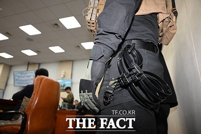 직접 케이블타이 수갑 묶은 박선원 "타이는 국회의원 끌고 가기 위한 것" [TF사진관]