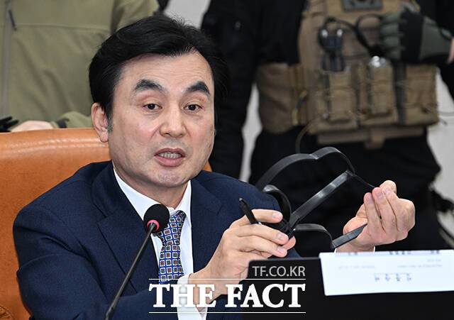 [더팩트ㅣ국회=박헌우 기자] 박선원 더불어민주당 의원이 21일 오전 서울 여의도 국회에서 열린 '윤석열 정부의 비상계엄 선포를 통한 내란 혐의 진상규명 국정조사 청문회'에 참석해 707 특임대가 계엄 당시 국회에 반입한 케이블타이 수갑을 시연하고 있다.