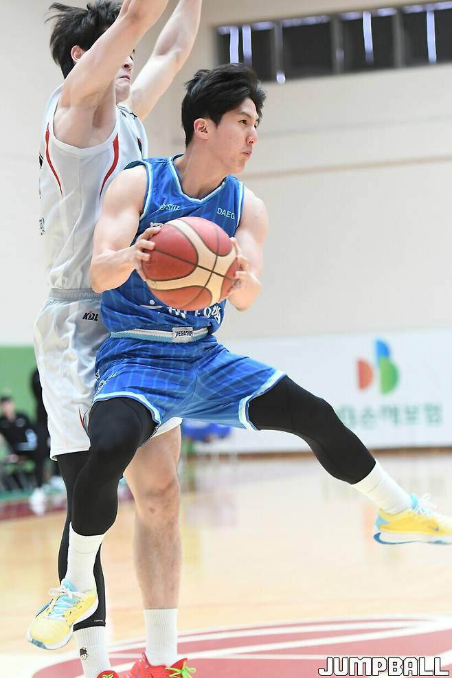 [점프볼=이천/박상혁 기자] 21일 이천 LG챔피언스파크에서 열린 2024-2025 KBL D리그 한국가스공사와 KT의 경기, 한국가스공사 우동현이 골밑으로 들어가 패스를 시도하고 있다.