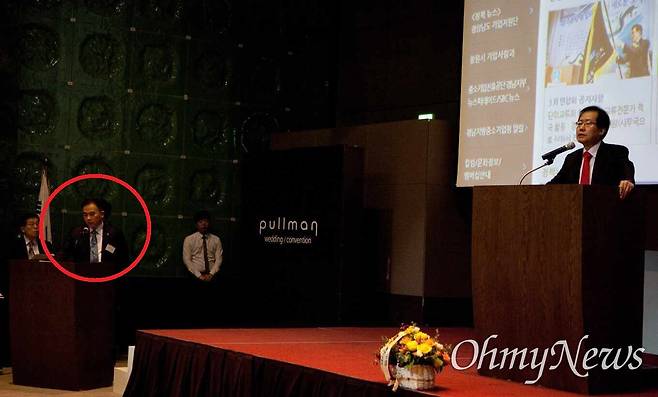 | ▲ 지난 2014년 홍준표 당시 경남도지사가 중소기업융합 경남연합회가 주최한 행사에 참석해 축사를 하는 모습. 당시 사진에 명태균씨가 사회자로 서 있는 모습이 보인다. |