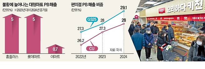 고물가와 경기 불황 속에 '짠물 소비'가 확산하면서 대형마트와 편의점업계 간 자체브랜드(PB) 상품 경쟁이 치열해지고 있다.