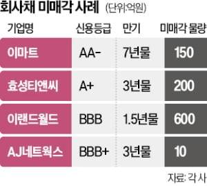 이달 들어 효성티앤씨(A+), 이랜드월드(BBB), AJ네트웍스(BBB+) 등도 회사채 미매각을 피하지 못했다. 효성그룹 계열사 효성티앤씨는 17일 1000억원 모집을 목표로 수요예측을 진행해 3년물에서 미매각이 났다. 3년물 600억원 모집에 400억원이 들어오는 데 그쳤다.