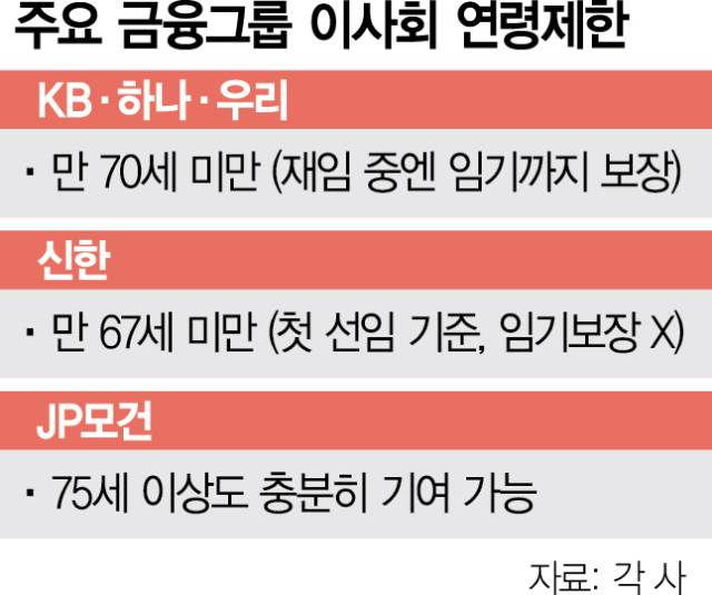 21일 금융계에 따르면 KB·신한·하나·우리금융지주(316140)는 회장 선출에 나이 제한을 두고 있다. KB·우리금융은 선임 및 재선출 시 연령을 만 70세 미만으로 하고 재선임 당시 나이가 만 70세 미만이라면 부여 받은 임기까지 수행할 수 있도록 규정했다. 하나금융도 지난해 12월 내규 개정을 통해 재임 중이라면 만 70세가 넘어도 임기를 마칠 수 있도록 했다. 신한금융은 회장 선임시 연령을 만 67세로 규정하고 연임하더라도 재임 기한이 만 70세를 넘기지 못한다. BNK금융지주의 경우 나이 제한이 없는 대신 한 차례만 연임할 수 있는 연임 제한 규정을 두고 있다. 2011년 하나금융을 시작으로 도입된 나이 제한이 광범위하게 펴져 있는 셈이다.