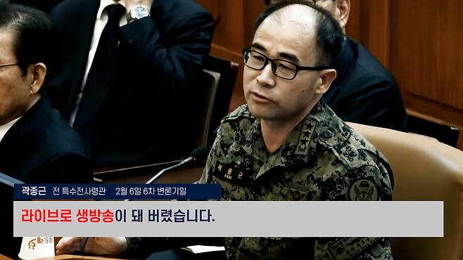 곽종근: 저도 나중에 알았는데 이 마이크를 지금 이게 켜 있지 않습니까? 이게 시작할 때부터 마이크가 이제 명령하다 이게 켜져 있었는데 이걸 안 끄고 그대로 끝날 때까지 그대로 뒀었던 거 같습니다. 예 그렇게 하다 보니까 제가 얘기하는 것, 장관 지시하는 것, 대통령 지시받고 막 얘기하는 것, 이런 내용들이 명령 하달 때부터 끝날 때까지 예하 전체 인원들에게 라이브로 생방송이 돼 버렸습니다. (중략) 여단장은 지휘통제실에서 들렸던 스피커 방송이 자기 차량 스피커로 그대로 연동이 돼서 거기서 막 내용들이 다 생중계돼서 넘어갔던 모양입니다. (2월 6일 6차 변론기일)