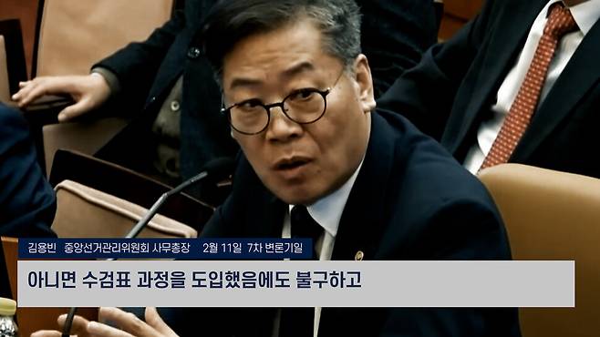 윤석열의 대학 친구인 김용빈 중앙선거관리위원회 사무총장은 더 적극적으로 부정선거 음모론을 비판했습니다. 김 총장은 국정원과의 합동 보안 점검과 관련해 “당시 모의 해킹 환경을 구성한 것이고 실제 상황에선 데이터 조작이 불가능하다”는 취지의 질문에 “네”라고 답했습니다. 부정선거 의혹 해소를 위해 “사전 투표함의 보관 장소를 CCTV로 24시간 공개하거나 개표 과정을 감시하는 수검표를 도입해 왔는데도 계속 부정선거라 생각하는 국민들이 있어 안타깝다”고도 했습니다.