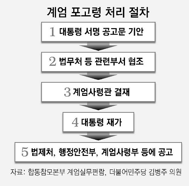합참 계엄실무편람의 ‘계엄 조치문 처리 절차’ 등에 따르면 합참 계엄과는 대통령 서명이 들어간 공고문을 국방부로부터 전달받아 법무처 등 관련 부서 협조를 얻은 뒤, 계엄사령관 결재를 거쳐 대통령 재가를 받은 다음 공고해야 한다. 권 전 과장에 따르면 비상계엄 선포 당시엔 이 같은 사전 절차가 제대로 지켜지지 않았다는 것이다. 그는 “서명이 들어간 포고령(공고문)은 못 봤고 계엄이 끝나갈 즈음에 다른 곳에서 서명이 안 된 복사본은 본 적이 있다”고 했다.