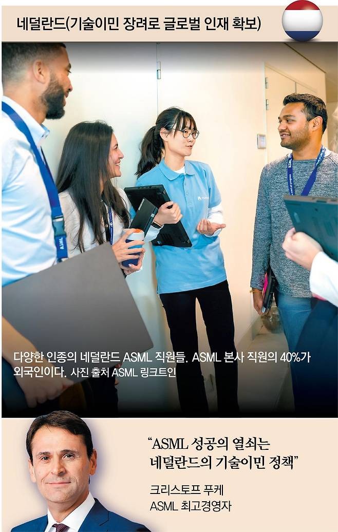 일본의 유명 반도체 장비업체 니콘도 포기한 EUV 리소그래피 장비를 ASML이 개발해 낸 비결에는 네덜란드 정부의 기술이민 지원 정책 덕이 컸다. 인구 1800만 명인 네덜란드는 기술력이 있는 외국인 노동자에게 5년간 급여의 30%를 세액 공제하는 등 다양한 지원 정책을 실시해 왔다. 그 결과 ASML의 네덜란드 본사 직원 2만3000명 중 40%가 외국인으로 채워질 정도로 해외 인재 유치에 성공했다. 크리스토프 푸케 ASML CEO는 지난해 10월 블룸버그통신과의 인터뷰에서 “세계 100개국 이상에서 이민을 받아들인 것이 ASML 성공의 열쇠”라고 말했다.