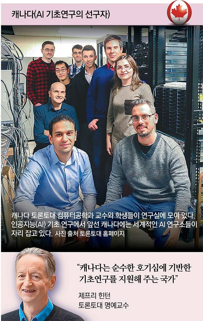 AI 기초 연구에 지속적으로 투자한 결과 캐나다에는 세계적인 수준의 AI 연구소들이 자리 잡게 됐다. 힌턴 교수가 이끄는 벡터 연구소, 벤지오 교수가 세운 밀라 퀘벡 AI 연구소 등이 대표적이다. 캐나다 정부에 따르면 2023년 기준 14만 명의 AI 전문가들이 캐나다에 있다. 힌턴 교수는 조국을 떠나 캐나다로 온 이유에 대해 “돈을 많이 줘서 캐나다로 온 건 아니다”라며 “순수한 호기심에 기반한, 상업성이 떨어질 수 있는 기초연구에도 비중을 두고 지원해 주는 캐나다 사회가 마음에 들었다”고 현지 매체에 말했다.