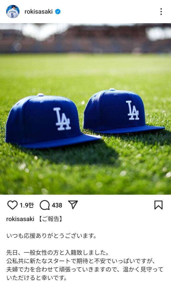 LA 다저스에서 새로운 야구 인생을 시작하는 사사키 로키(24)가 깜짝 결혼 발표를 했다.