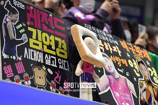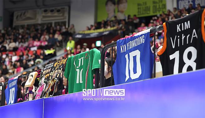 체육관에 걸린 김연경의 유니폼들과 피켓