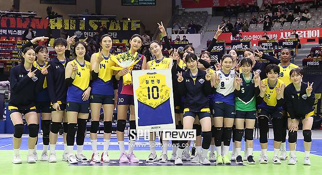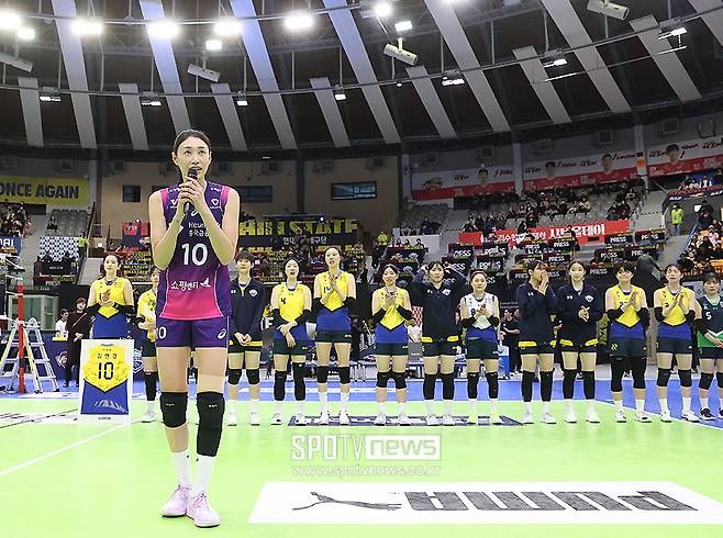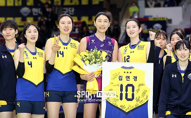 국가대표팀에서 오랜 시간 함께했던 '절친' 양효진은 선수단을 대표해, 김연경에게 사인이 새겨진 유니폼 액자를 전달했고 강성형 감독도 김연경에게 꽃다발을 주며 그의 은퇴를 진심으로 축하했다.