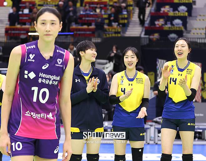 경기 종료 후 진행된 김연경의 은퇴 투어. 쑥스러워하는 김연경을 바라보며 박수를 보내는 절친 양효진