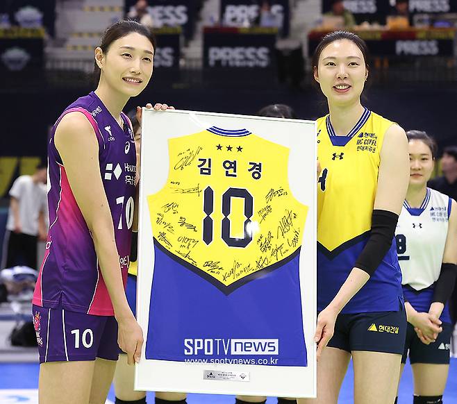 쑥스러운 표정으로 코트에 입장하는 김연경을 보고, 양효진은 크게 웃으며 긴장을 풀어줬다. 국가대표팀에서 오랜 시간 함께했던 '절친' 양효진은 선수단을 대표해, 김연경에게 사인이 새겨진 유니폼 액자를 전달했고 강성형 감독도 김연경에게 꽃다발을 주며 그의 은퇴를 진심으로 축하했다.