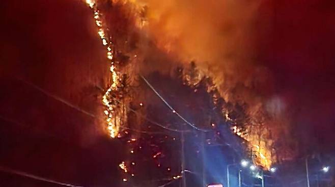 어두운 밤, 붉은 화염이 산등성이를 타고 번져나갑니다.