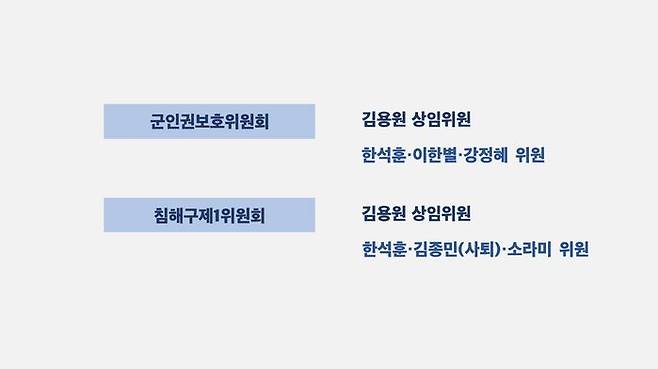 군인권보호위원회엔 김용원 상임위원 외에 한석훈·이한별·강정혜 위원이 있습니다. 대법원장이 지명한 강정혜 위원은 해외 체류 중이었지만 윤 대통령과 여당 측이 추천·지명한 나머지 세 사람이 신속하게 회의를 열고 의견표명 결정까지 내릴 수 있었습니다. 반면 침해구제1위원회는 김용원 상임위원 말고도 한석훈·김종민·소라미 위원이 포함돼 있습니다. 여기도 소라미 위원을 제외하면 여권 성향이 세 명으로 의결 정족수를 채우도록 구성됐습니다. 그런데 이 가운데 대통령 측 추천 인사였던 '원명스님' 김종민 위원이 '윤 대통령 방어권 보장' 권고안 후폭풍 속 지난달 돌연 사퇴해 버린 겁니다. 이로써 침해구제1위원회는 김용원·한석훈·소라미 위원으로 당분간 3인 체제를 유지하게 됐습니다.