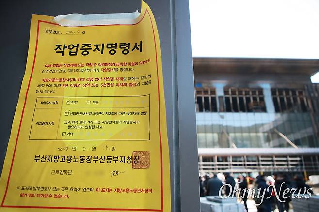 | ▲ 지난 14일 부산 기장군 '반얀트리 해운대 부산' 화재 참사와 관련해 유가족들이 22일 첫 공개 기자회견을 연 가운데, 현장에 부산고용노동청의 작업중지명령서가 부착돼 있다. |