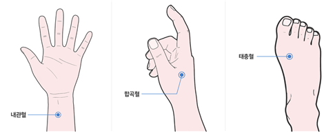 2.합곡혈(엄지와 검지 사이 솟은 부위),태충혈(첫번째와 두번째 발가락 사이 오목 부위)
