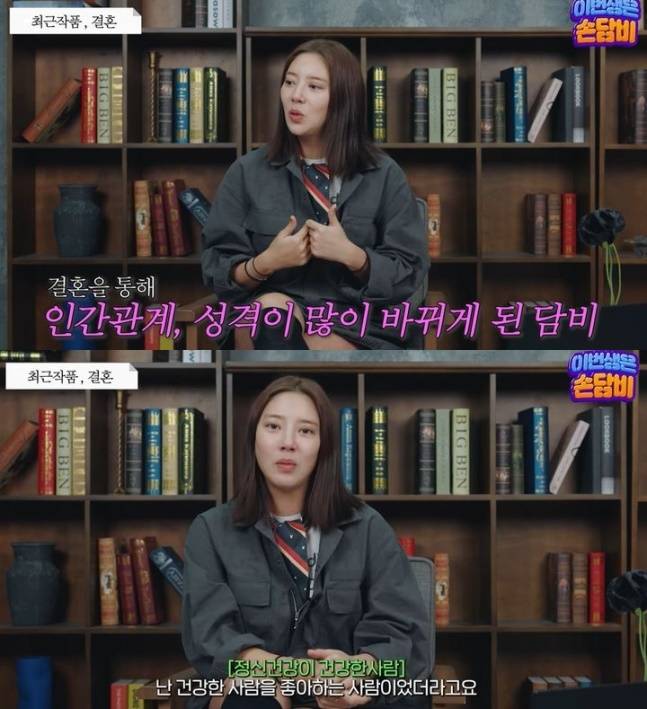 그는 "전에 그런 게 있었다, 어두운 거 좋아하고 내가 아티스트가 된 마냥, 이상한 게 있었다. 내가 한창 그런 거에 빠져있었을 때였다. 남자도 그런 쪽을 좋아하는 줄 알았다. 결혼하고 느끼는 건 나는 건강한 사람을 좋아하더라"라며 이규혁과 결혼 이후 많은 것을 느꼈다고.