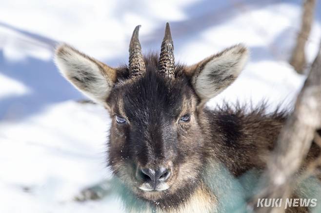 눈 덮인 양구 해안면의 한 계곡 초입에서 산양과 잠시 마주쳤다.