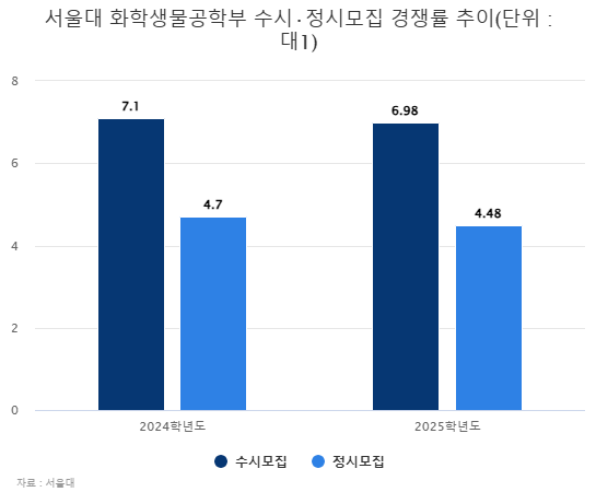 서울대 입학을 원하는 수험생에게도 비슷한 현상이 발생하고 있다. 서울대가 학생부종합전형을 첫 도입했던 2024학년도 신입생 모집 당시 화학생물공학부의 수시 일반전형 경쟁률은 7.1대 1이었지만, 이듬해 6.98대 1로 하락했다. 같은 기간 정시 모집 경쟁률은 4.7대 1에서 4.48대 1로 떨어졌다.
