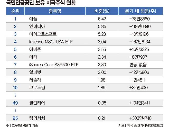 ![국민연금공단은 지난해 4분기 미국 포트폴리오에서 브로드컴, 팔란티어, 램 리서치 비중을 늘렸다. [각 사 제공]](https://img3.daumcdn.net/thumb/R658x0.q70/?fname=https://t1.daumcdn.net/news/202502/23/weeklydonga/20250223090119121suvb.jpg)