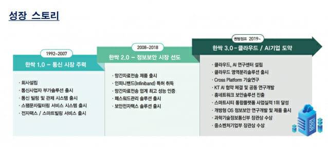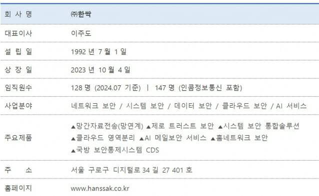 "1992년 7월 설립 이후 30년 이상 업력과 기술력을 바탕으로 3세대에 걸쳐 지속 성장해온 국내 대표 보안 및 AI 전문기업이다. 설립 초기에는 이동통신사업자를 대상으로 빌링(과금)시스템, 통신관제시스템, 스팸문자필터링 서비스, 전자팩스 솔루션 등을 공급하며 성장했다. 2010년 망간자료전송(망연계) 솔루션을 시작으로 보안사업을 본격화했다. 2023년 10월 코스닥 시장에 상장했고, 현재 직원 수는 120명이다. 자회사인 인콤정보통신까지 합치면 150명이다."