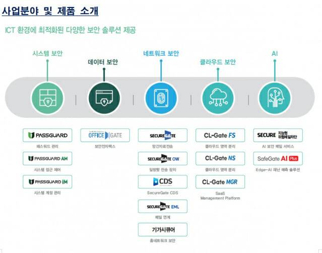 "ICT 환경에 최적화한 다양한 솔루션들을 개발해 제공하고 있다. 크게 5가지로 ▲네트워크 보안(4종) ▲시스템 보안(3종) ▲데이터 보안(1종) ▲클라우드 보안(3종) ▲AI 솔루션 및 서비스(2개 서비스)를 제공하고 있다."