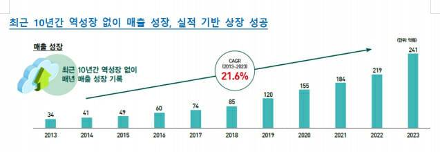 무선통신시스템에서 출발, 2010년 보안시장에 진출했고, 이후 국내 망연계 솔루션 시장을 개척해왔다. 현재 8종의 제품을 시장에 공급하고 있다. 올해 4종을 새로 출시한다. 매출은 지난 2013년부터 2023년까지 10년간 21.6%의 연평균 성장률을 기록했다. 2019년 100억대를 넘었고(120억) 이어3년만인 2022년 200억대를 돌파(219억)했다.