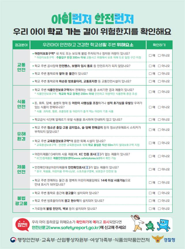 행안부는 가정에서도 쉽게 아이 주변 위해 요소를 확인할 수 있도록 ‘아이먼저, 안전하고 건강한 학교생활 체크리스트’를 행정안전부 누리집(정책자료>참고자료>개학기(1학기) 초등학교 주변 위해요소 점검 관련 자료)을 통해 배포할 계획이다.