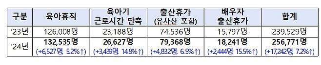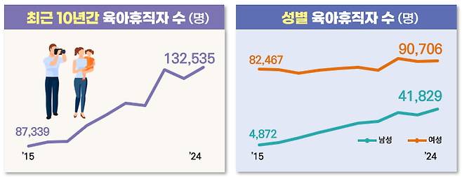 지난해 육아휴직자는 13만2535명으로 전년도인 2023년 12만6008명 대비 6527명(5.2%) 증가했다. 출생아 수 감소 추세에 따라 2023년 다소 감소했던 육아휴직 사용자는 다시 증가세로 돌아섰다.