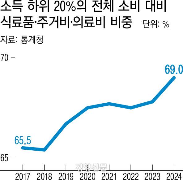 경향신문이 23일 통계청의 가계금융복지조사를 분석한 결과, 지난해 소득 1분위(하위 20%)의 전체 소비지출에서 식료품과 주거비, 의료비가 차지하는 비중은 69.0%로 집계됐다. 이는 2017년 관련 통계 개편 이후 가장 큰 비중이다. 2017∼2018년에 약 65%였던 이들 품목 비중은 2020년이후 횡보하다가 지난해 다시 늘었다.