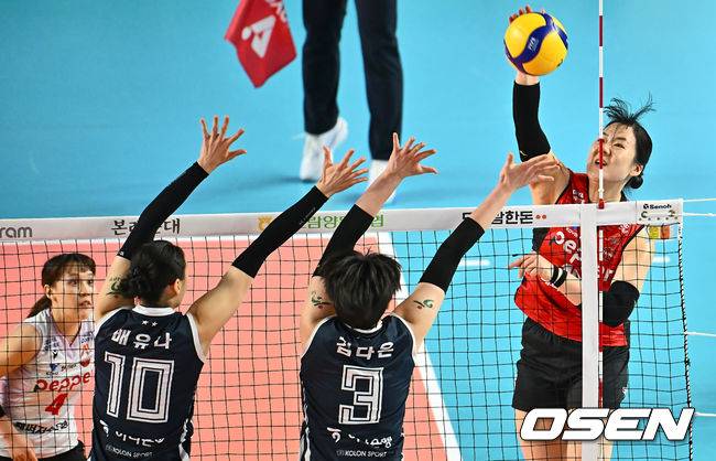 페퍼저축은행 이한비가 한국도로공사 배유나, 김다은의 블로킹을 뚫고 스파이크를 날리고 있다. 2025.02.23 / foto0307@osen.co.kr