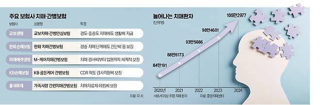 고령화와 함께 치매환자가 가파르게 늘고 있다. 지난해 국내 치매환자는 처음으로 100만 명(65세 이상)을 넘겼다. 치매에 걸리면 치료비 등으로 연간 2000만원 넘게 드는 것으로 알려지면서 보험 가입을 고려하는 수요가 많다. 보험사들도 새 고객을 잡기 위해 치매·간병보험 상품을 강화하는 추세다.