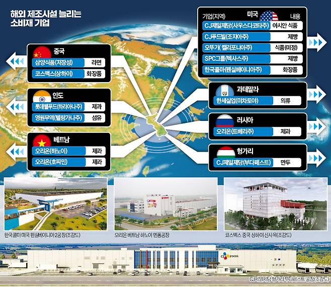 해외 사업 확대를 위해 반드시 해외에 공장을 지어야 하는 것은 아니다. 국내 공장에서 만들어 수출하는 방법도 있다. 하지만 밀가루·옥수수 등 원재료 대부분을 해외에서 조달하는 데다 단가 대비 부피가 큰 식품의 물류비 등을 고려하면 해외 현지에 생산공장을 짓는 게 효율적이라는 것이 업계의 대체적 견해다. 오리온은 2006년 베트남에 공장을 짓고 현지 생산·판매를 시작했다. 18년 뒤인 지난해 오리온 베트남 법인은 매출 5145억원, 영업이익 1001억원을 올리며 한국, 중국에 이은 3대 핵심 거점으로 떠올랐다. 베트남 파이 시장에서 ‘초코파이’ 점유율은 60% 이상이다.