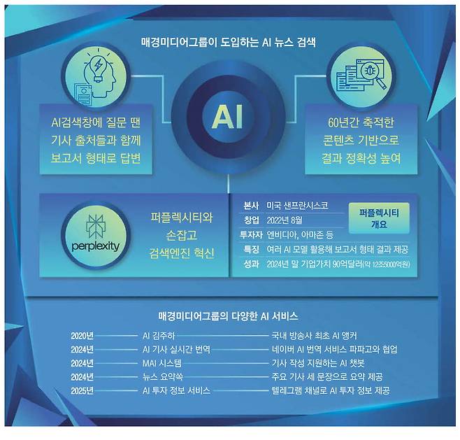 퍼플렉시티 API(운영체제와 응용 프로그램 사이의 통신에 사용되는 언어나 메시지 형식)를 활용한 새 AI가 1966년 매일경제가 창간된 후 데이터베이스(DB)로 축적한 약 1000만건의 매경미디어그룹 자체 생산 콘텐츠를 검색해 그 결과를 보여준다.