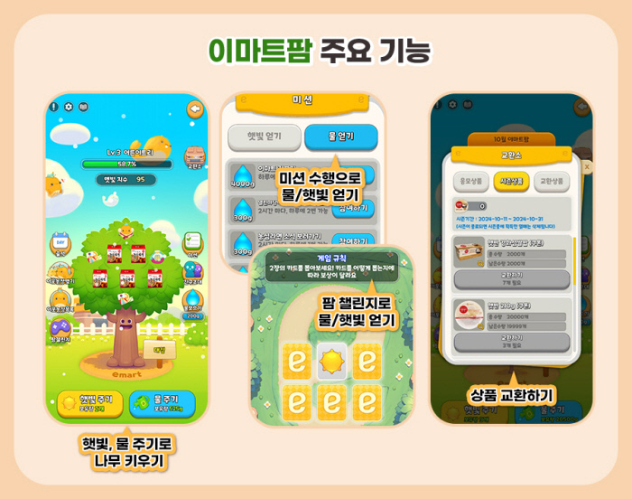 이마트는 지난해 앱 내 모바일 농장 콘셉트의 게이미피케이션 이마트팜을 론칭했다. 다양한 미션을 수행하며 얻은 보상으로 열매를 키우고 수확한 후 이를 실제 상품으로 교환할 수 있는 게이미피케이션 쇼핑 리워드 서비스다. 수확한 상품은 매장에서 수령 가능하며 매달 다른 상품으로 열매 수확이 진행된다.