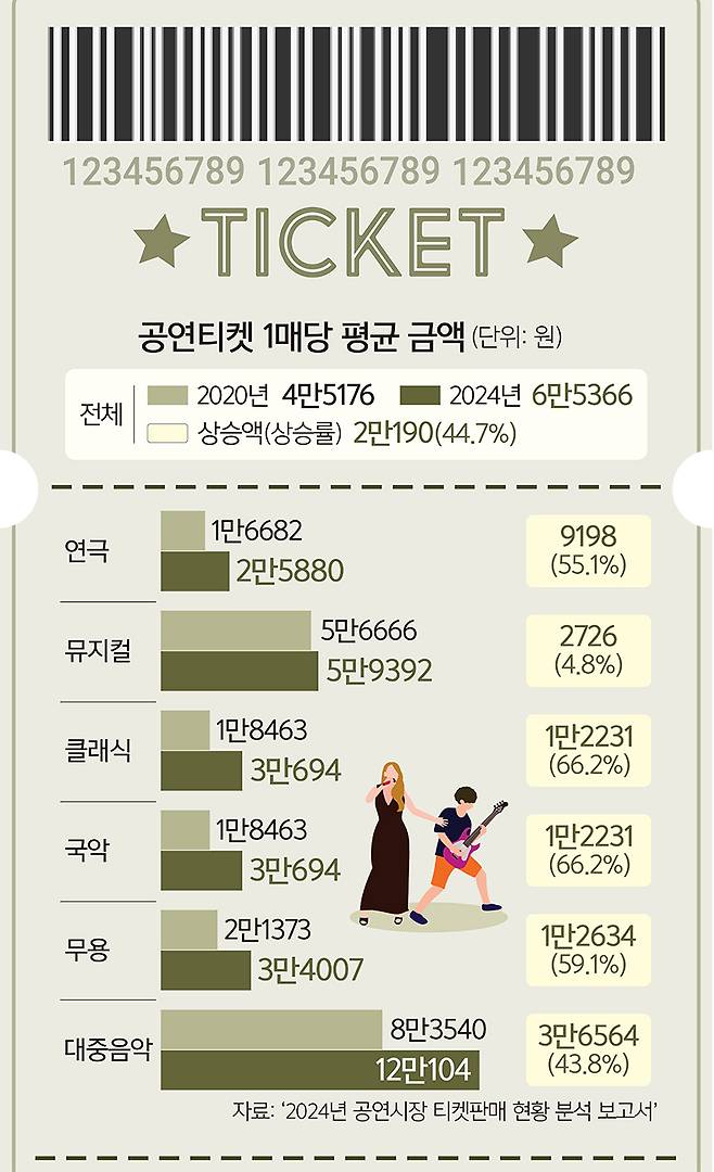 지갑 사정이 뻔한 사람들에게 적지 않은 관람료는 공연장 가기를 망설이게 한다. 게다가 공연 티켓 가격은 계속 올라 지난해 티켓 1장당 평균 관람료는 6만5366원으로 집계됐다. 이는 4년 전인 2020년에 비해 2만190원(44.7%)이나 오른 수준이다.