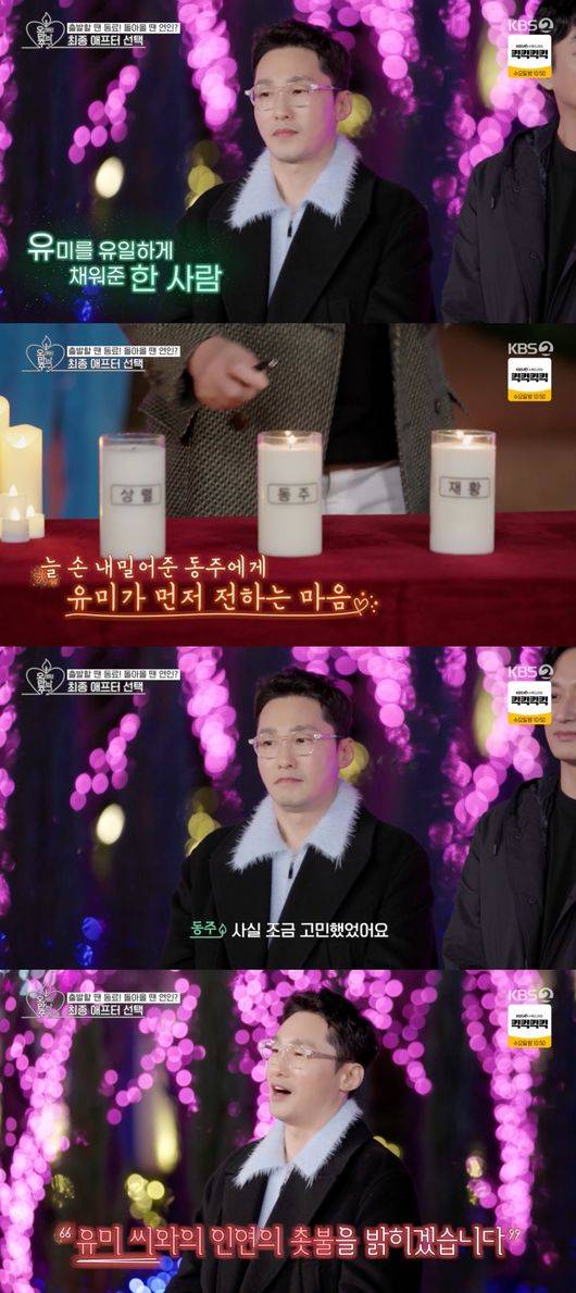 황동주 역시 "남이섬 다녀오고 확고해진 마음이 있었다"라며 "저는 그 분 덕분에 제가 연기자가 됐다는 거, 방송인이 됐다는 거에 대해서 너무 행복하다는 마음을 데뷔하고 이렇게 크게 느껴본 적이 없는 것 같다. 이런 큰 행복을 주신 분이 있어서 저는 촛불을 밝히겠다"라며 이영자를 선택했고, "그는 지금까지 뵌 건 너무 짧은 시간이었기 때문에 가능하다면 한 번 더 뵙고 얘기도 하고 싶고, 저는 이유미 씨와 인연의 촛불을 밝히겠다"라고 말해 설렘을 더했다.