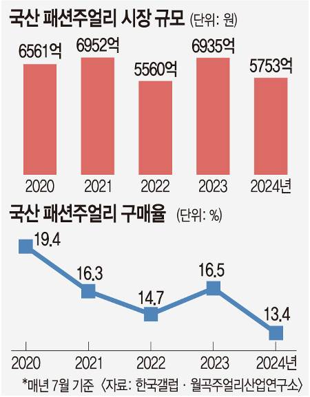 한국갤럽이 월곡주얼리산업연구소의 의뢰로 시행한 ‘패션주얼리소비자조사 2024’에 따르면 지난해 국산 패션 주얼리 구매율은 13.4%로 역대 최저치를 기록했다. 국산 구매율이 가장 높았던 2020년(19.4%)과 비교하면 구매량이 30.9%가량 줄어들었다. 최근 5년 새 들쭉날쭉하던 패션 주얼리 시장은 2023년 7000억원대를 육박했으나 지난해 5753억원으로 내려앉았다. 시장 규모 자체가 줄어든 가운데 국산 비중은 더 낮아지며 양극화 현상이 짙어졌다.