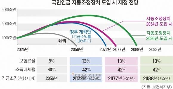 반면 국민연금법 개정 절차를 거치지 않고도 상황 변화에 유연하고 빠르게 대응해 재정 안정성을 확보할 수 있는 이점이 있다. 개혁에 따른 사회적 비용을 최소화하면서 수시 개혁을 할 수 있는 셈이다. 보건복지부에 따르면 국민연금 기금 소진 시기는 현행 제도에서 2056년이지만 자동조정장치를 도입하면 최대 32년(2088년) 늦춰진다.