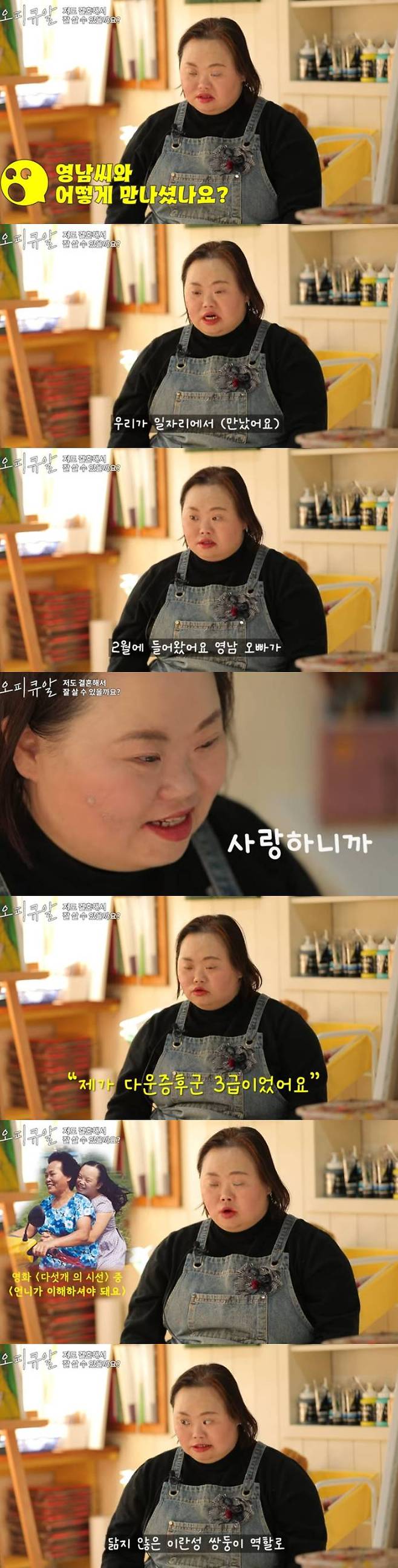 정 작가는 "제가 어릴때 이렇게 태어나서, 다운증후군으로 태어나서 이상했다. 말도 이상했고 남들보다 이상했다. 그리고 말도 더듬으면서 제가 다운증후군 3급이었다"라고 털어놨다.